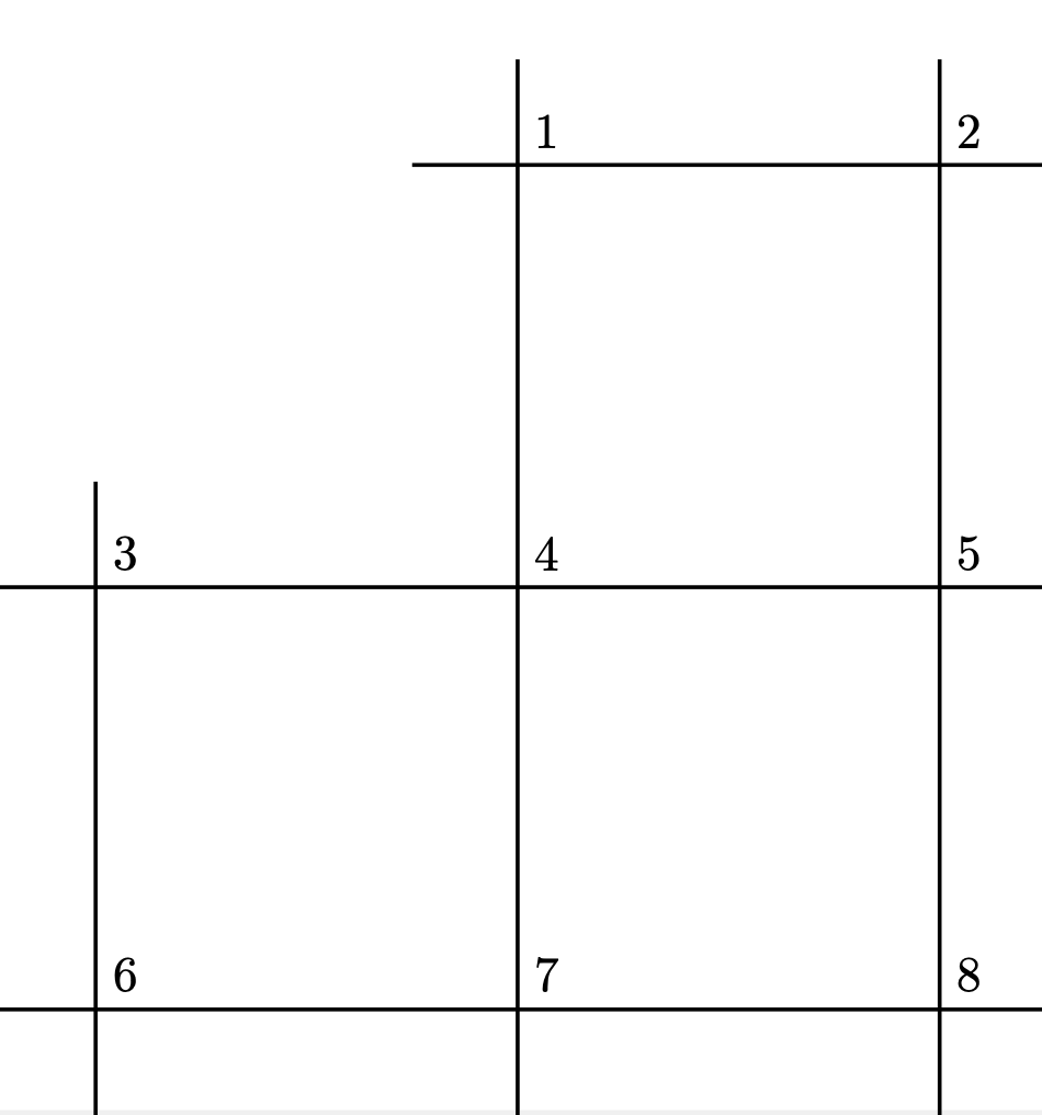 Un policier contrôle la circulation aux 8 intersections illustrées ci-dessous. Lorsqu’il arrive à une intersection, il y demeure une heure, puis décide aléatoirement d’aller à une intersection voisine ou de rester à celle où il est. Chaque possibilité a la même probabilité d’être choisie. Par exemple :