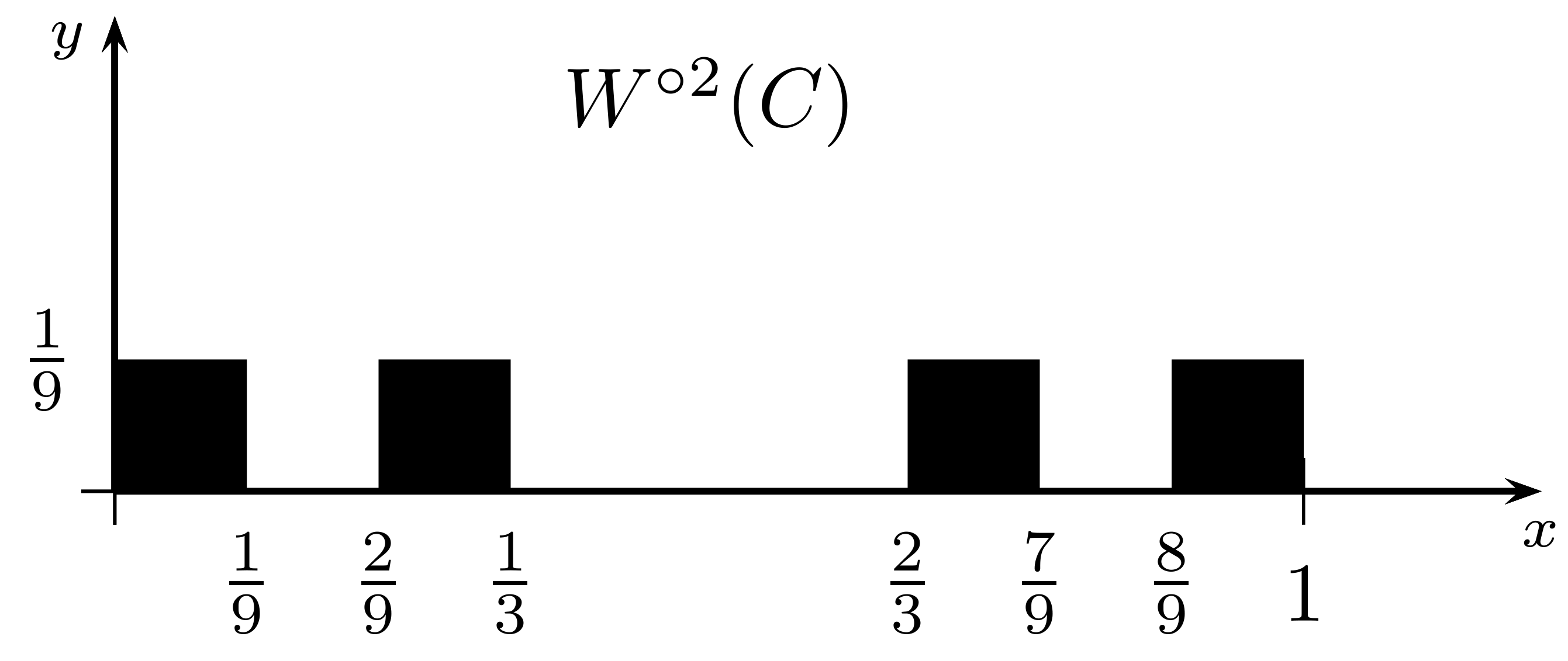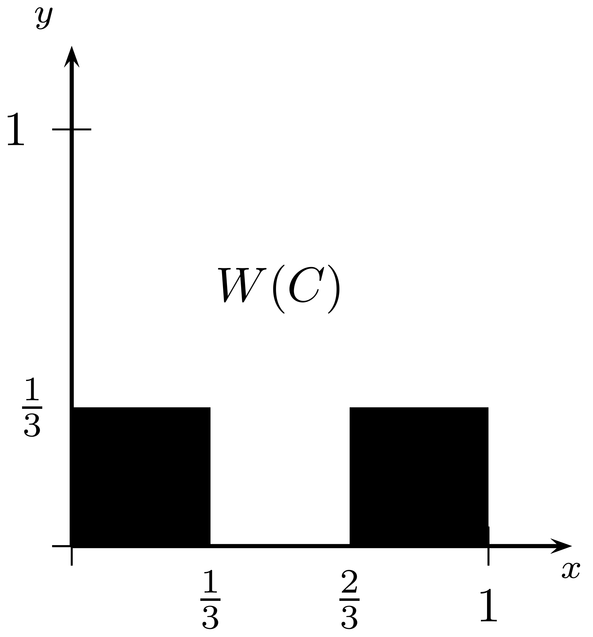 Considérons le SIF formé des contractions \[ w_1\begin{pmatrix} x \\ y \end{pmatrix} = \frac{1}{3} \begin{pmatrix} x \\ y \end{pmatrix}, \quad w_2\begin{pmatrix} x \\ y \end{pmatrix} = \frac{1}{3} \begin{pmatrix} x \\ y \end{pmatrix} + \begin{pmatrix} \frac{2}{3} \\ 0 \end{pmatrix}. \]