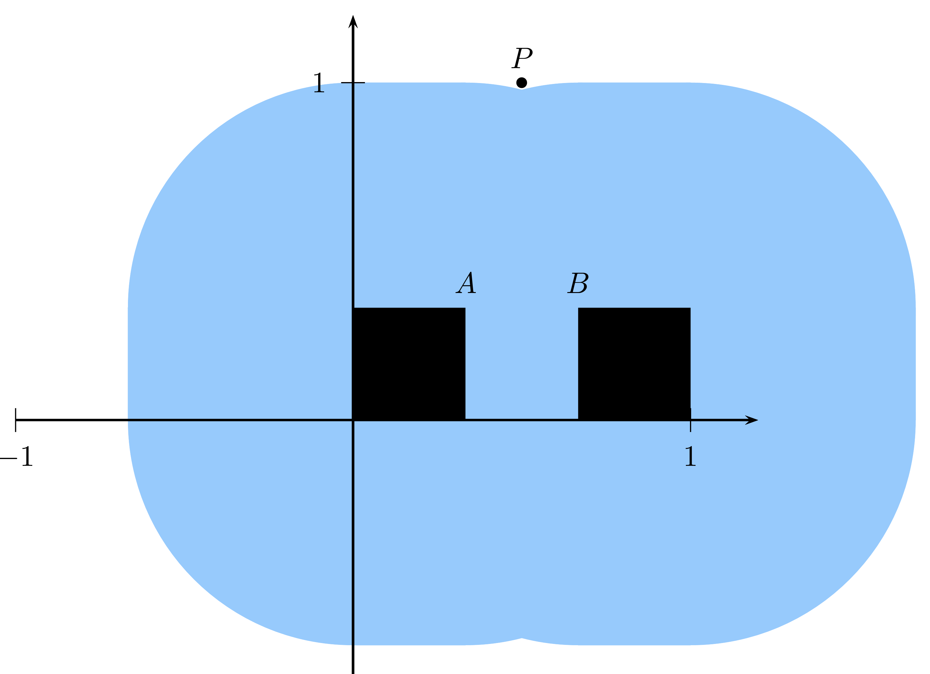 \(A = \{(1,1)\}\) et \(B = \{(x,y) : x^2 + y^2 \leq r^2\}\).